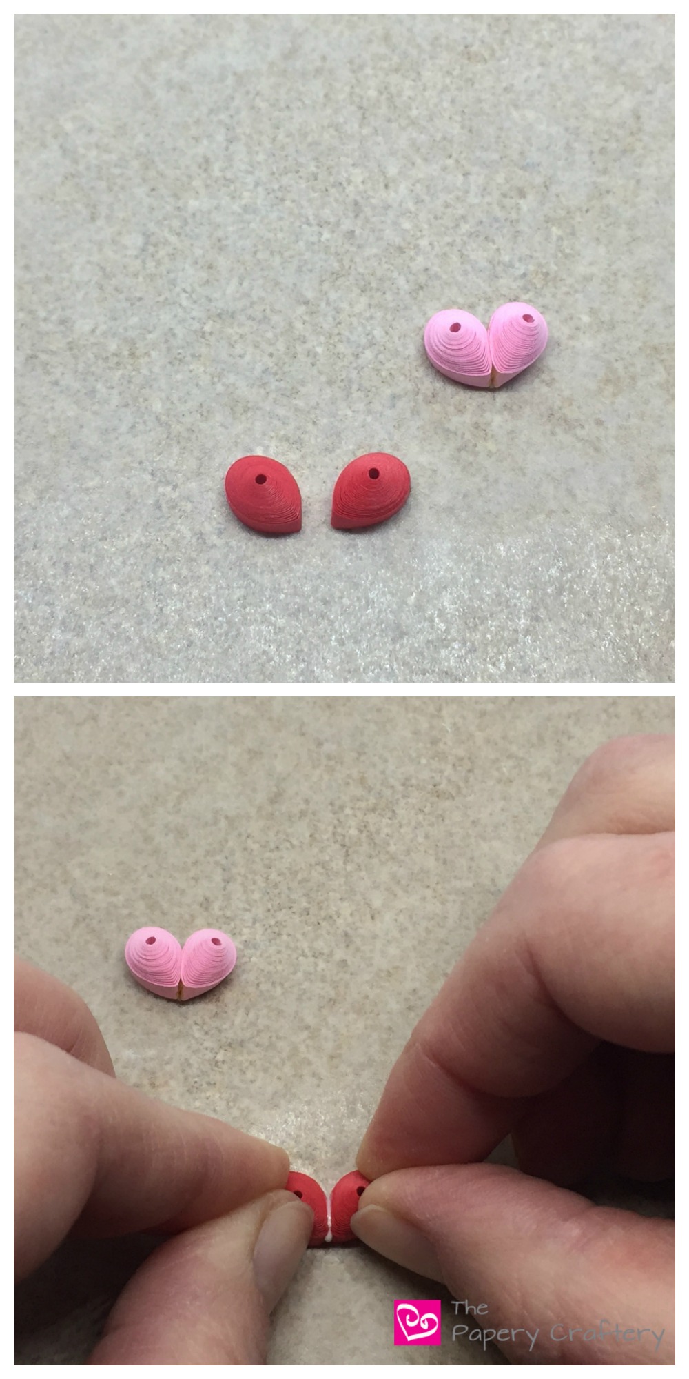 In order to make these hearts have the exact right shape, add a small line of glue to one side of a teardrop and squeeze them together.