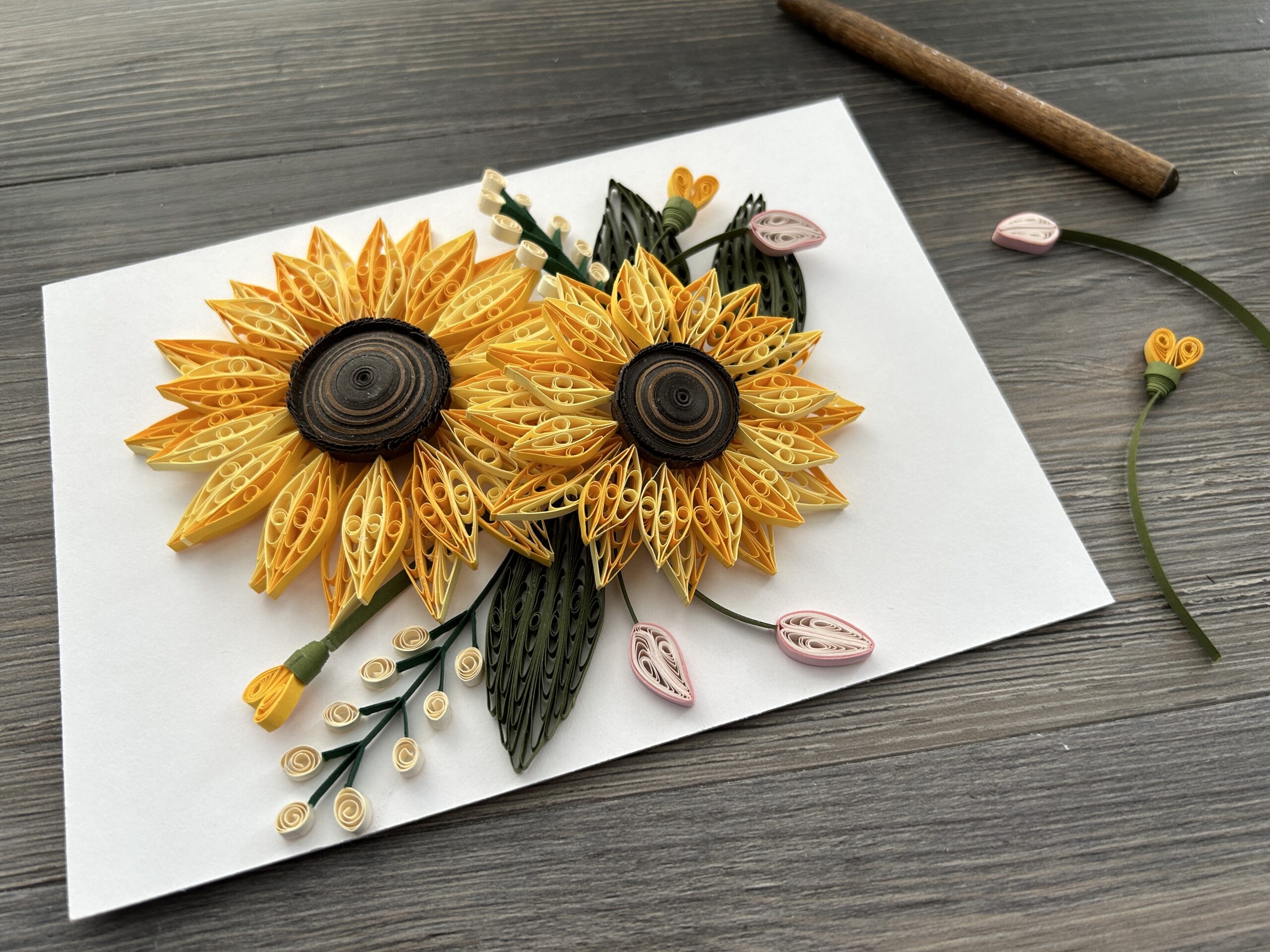 These quilling paper flower buds are simply adorable by themselves, but when I tuck them underneath a couple of paper sunflowers, the result is an eye-popper. Just full of life and texture!