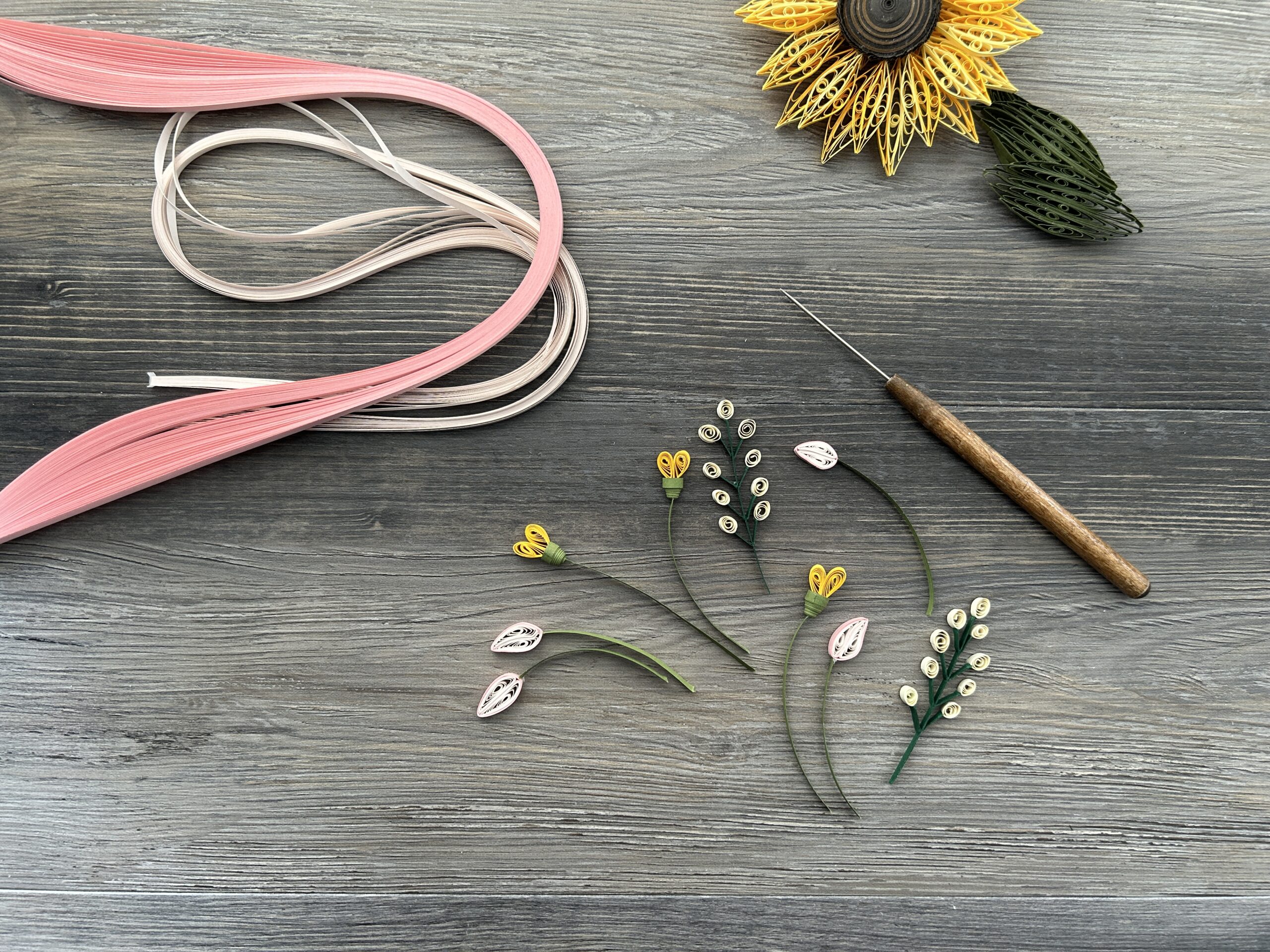 To boost the texture, detail, and life in your quilling paper flower designs, you may want to mix in some tiny buds. They can really up the awesomeness of your work by adding contrasting or complimentary colors, plus a little greenery.