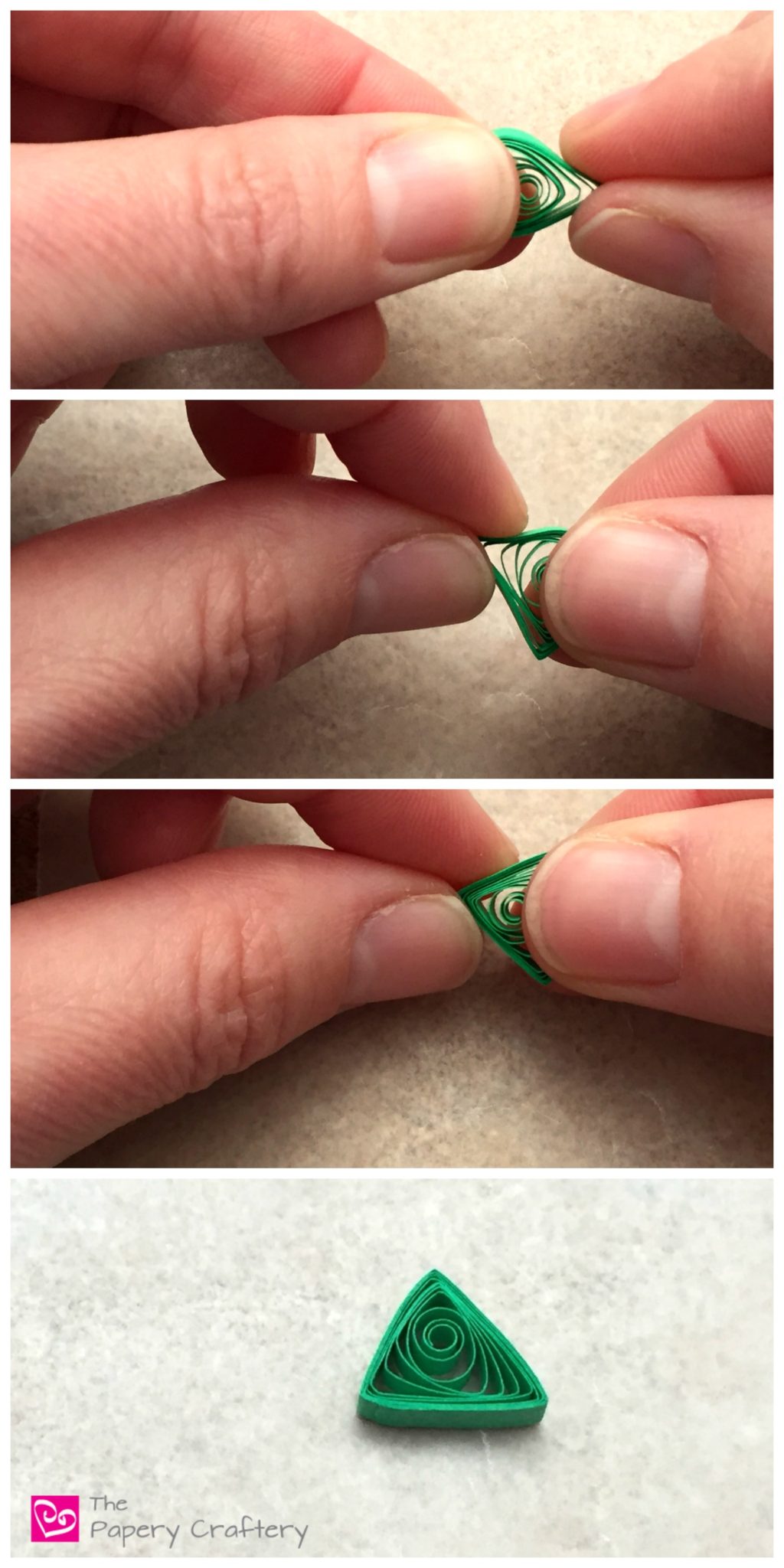 A quilling paper triangle is created by pinching 3 sides of a coil.