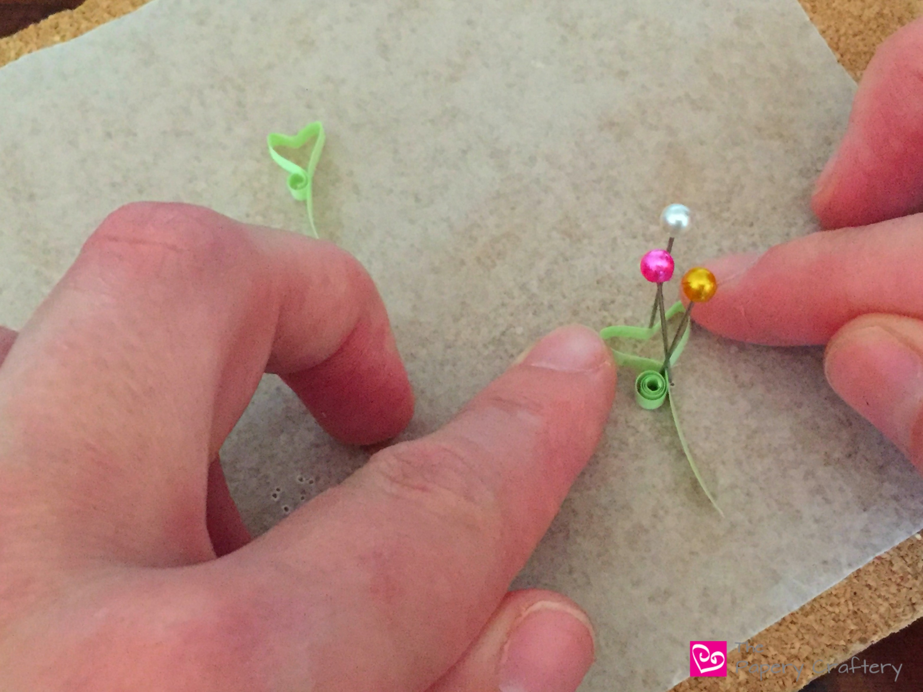 To finish the heart grass, use another pin to push in the center of the loop. This will make the loop into a heart shape! Sometimes it can be helpful to manipulate the sides of the heart with your fingers.