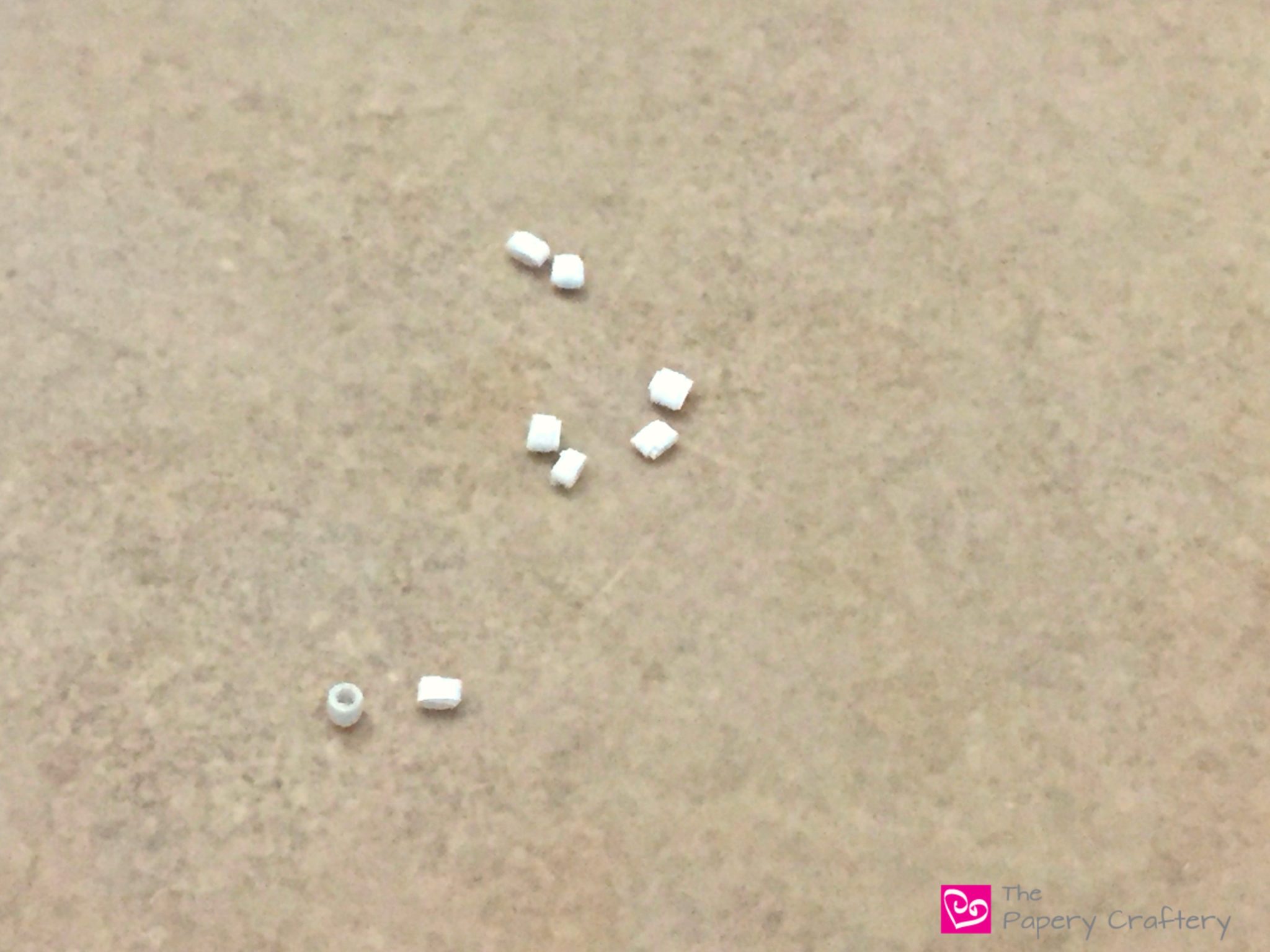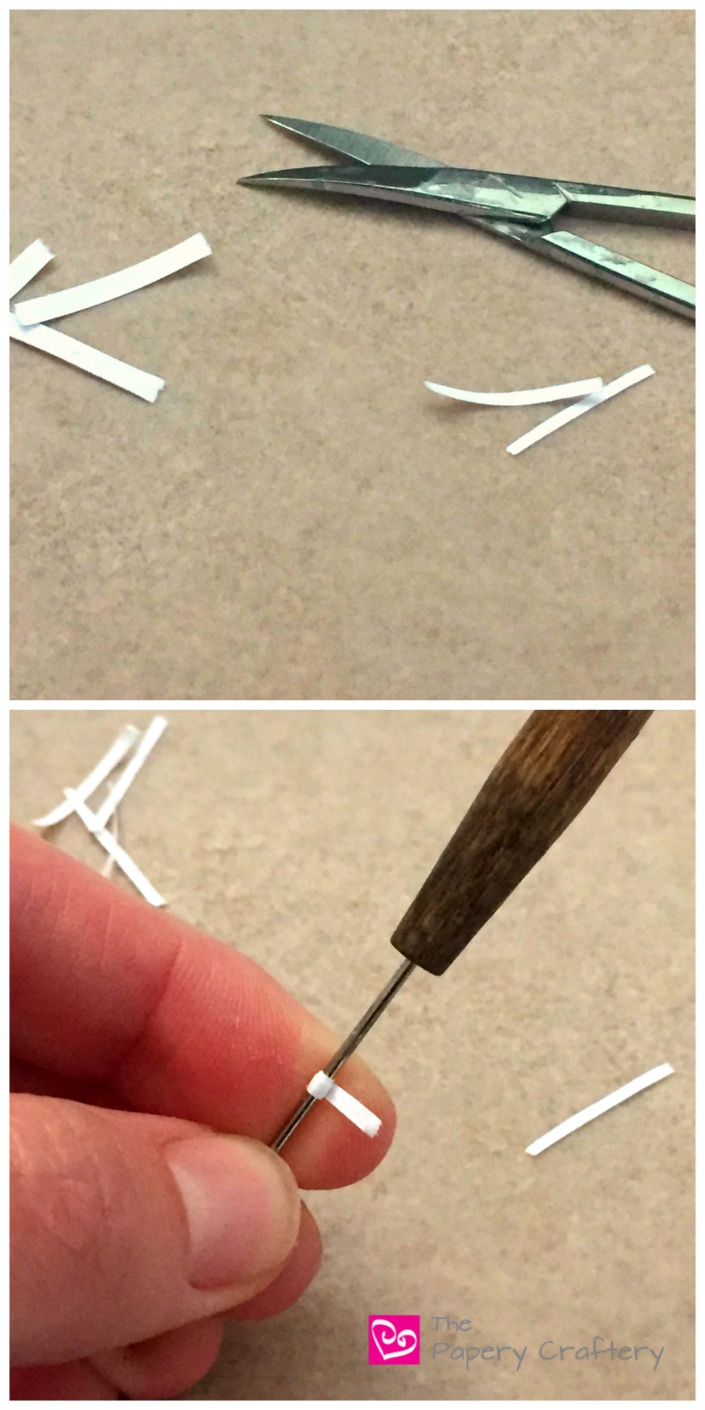 Cut 1″ strips of white quilling paper in half (watch those fingers!) and roll into a tight coil.