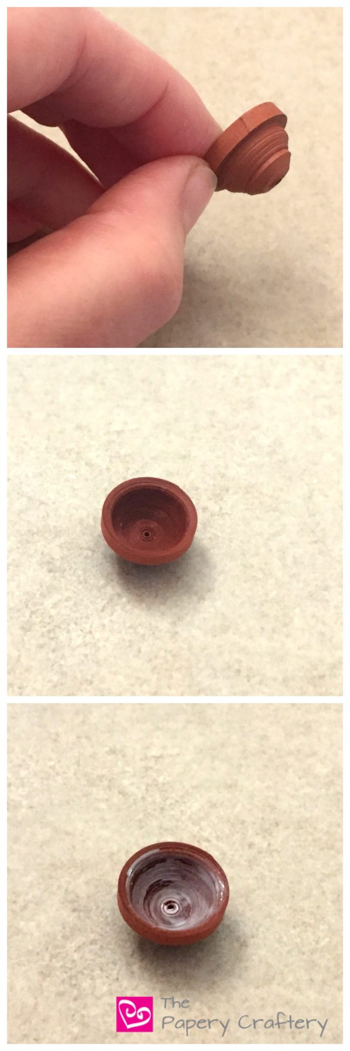 Start with a tight coil of 3 22″ brown paper strips, made the same way as the green.