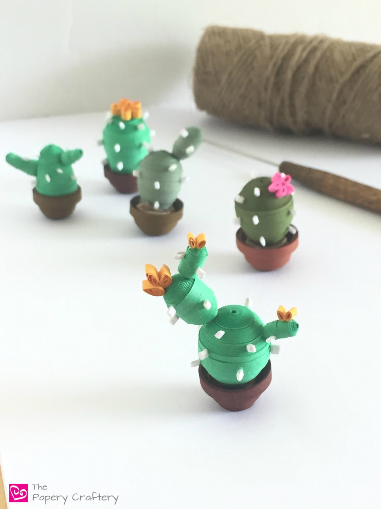 My cacti are all pretty small, about 1 1/2″ tall. You can absolutely make these as large as you like by adding more paper strips to each roll.