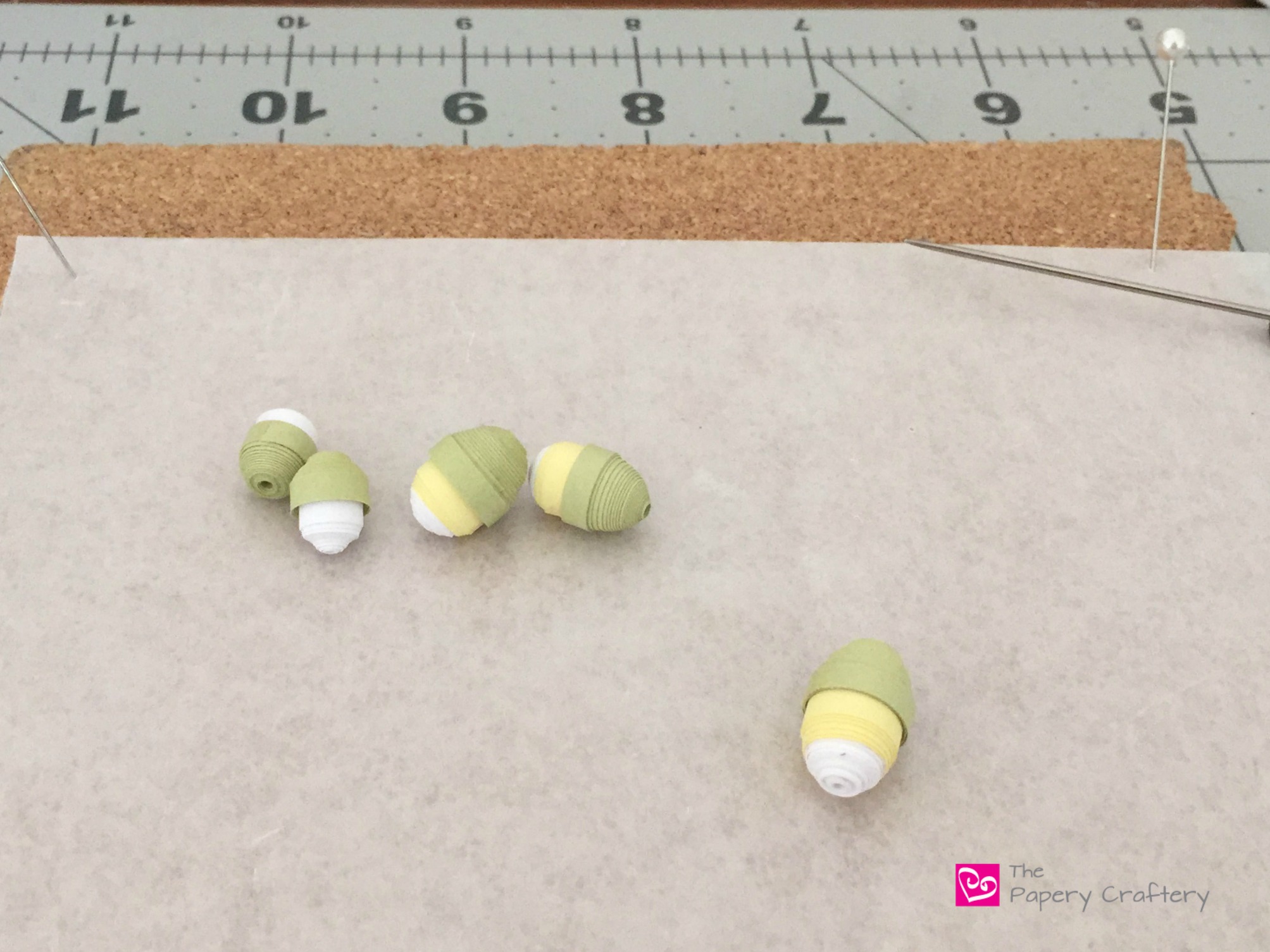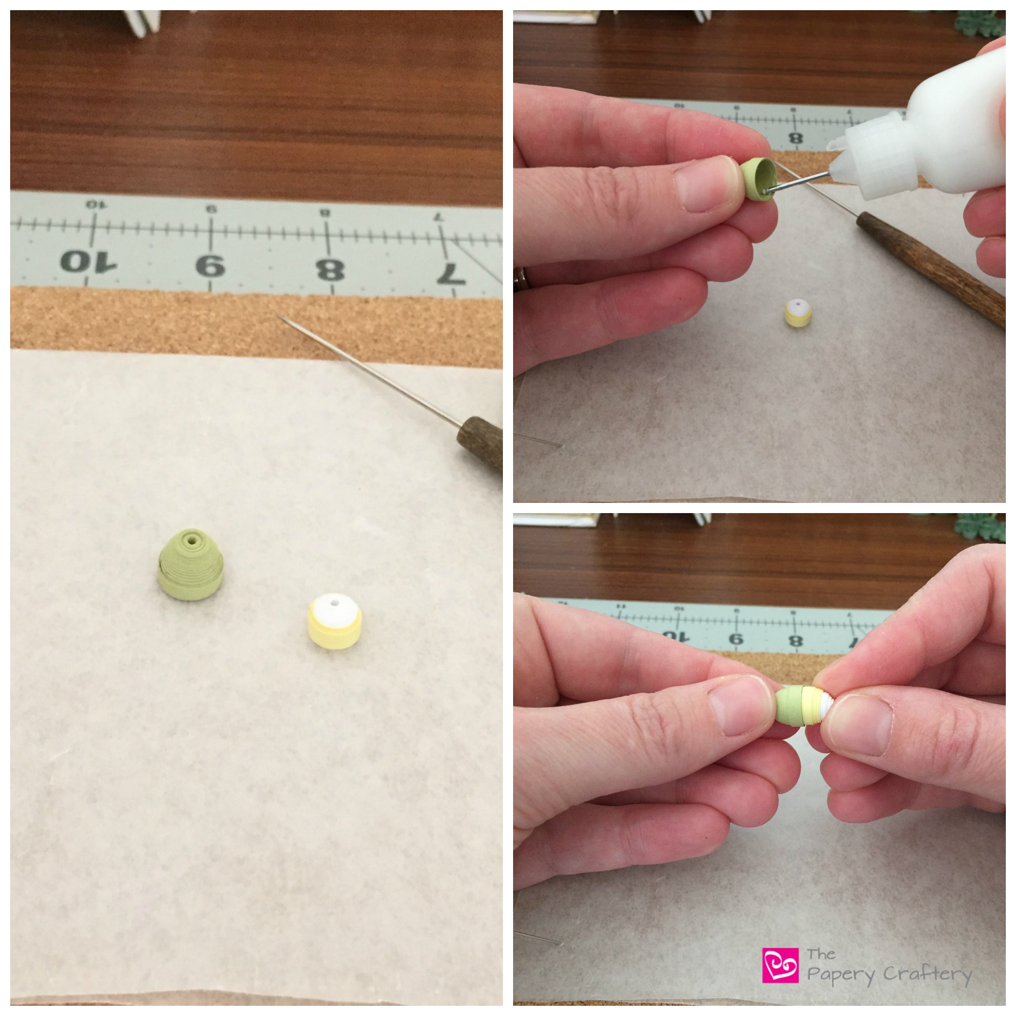 To create the other side of the flower bud, I rolled 16″ of pale green quilling paper into a tight coil, push into a dome, glue and dry. Β I attached the two halves of each flower bud, by adding a thin line of glue to the inside of the green dome, and placing the white and yellow part on the end.