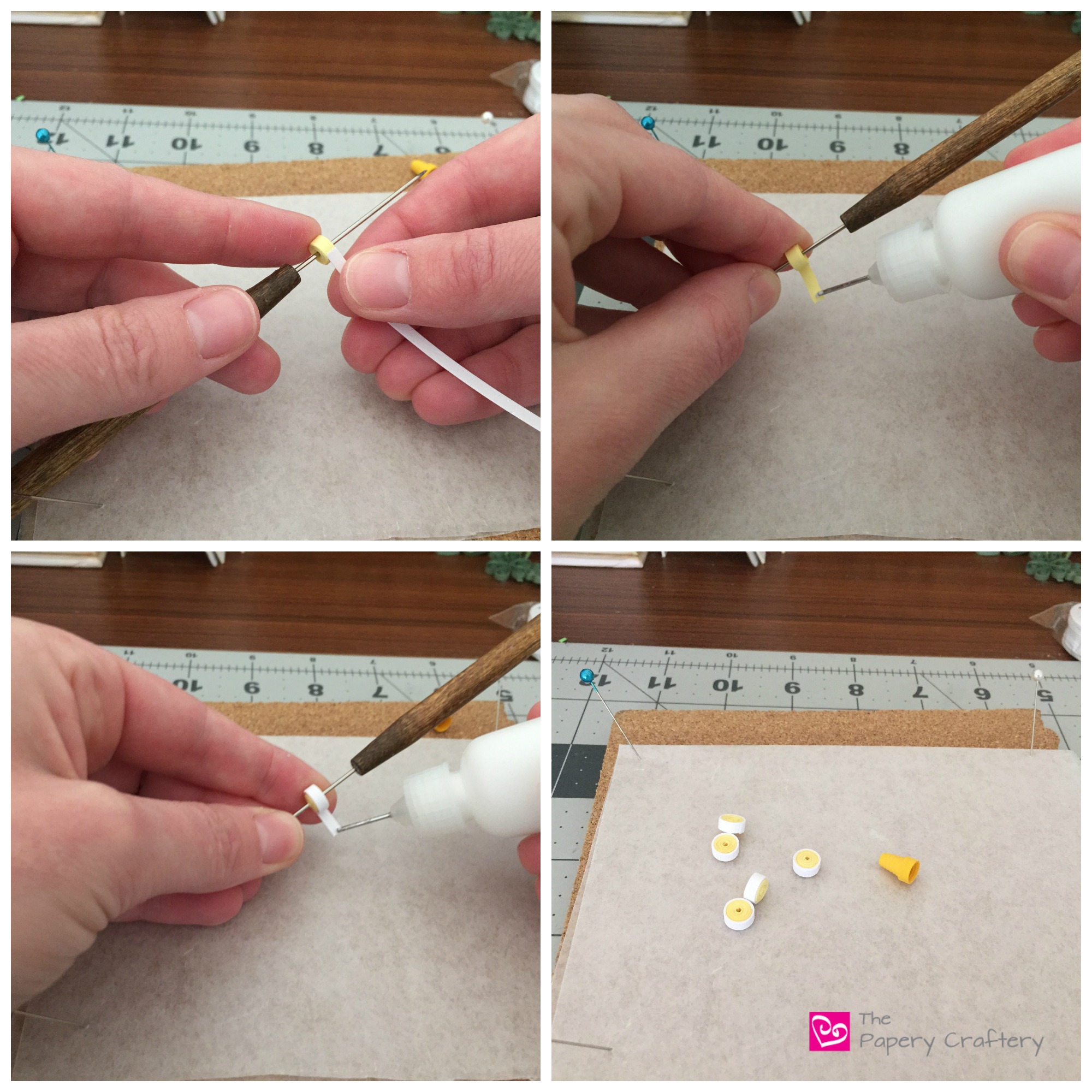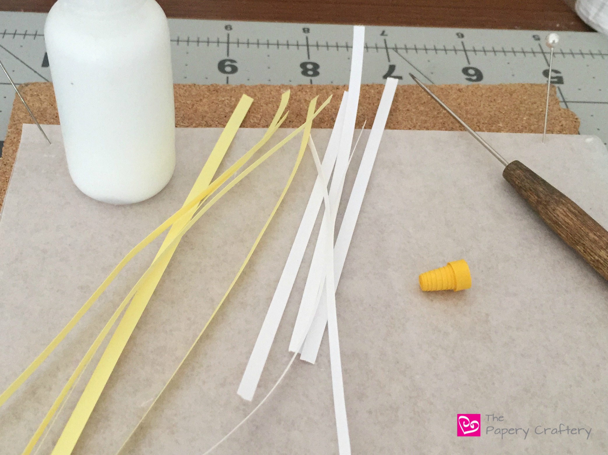 Only basic quilling supplies are needed for this flower tutorial. Β A little glue, a needle tool and a small brush, pale green, two shades of yellow and white 1/8″ width quilling paper.