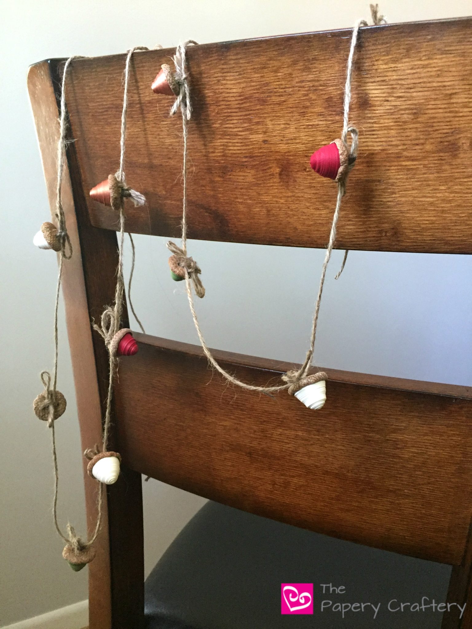 I realized pretty early on that the little, tiny acorn caps that I found in our backyard, while great for scattering paper acorns across a table or in a bowl, were just too small for garland purposes. Β They just wouldn’t really stand out.