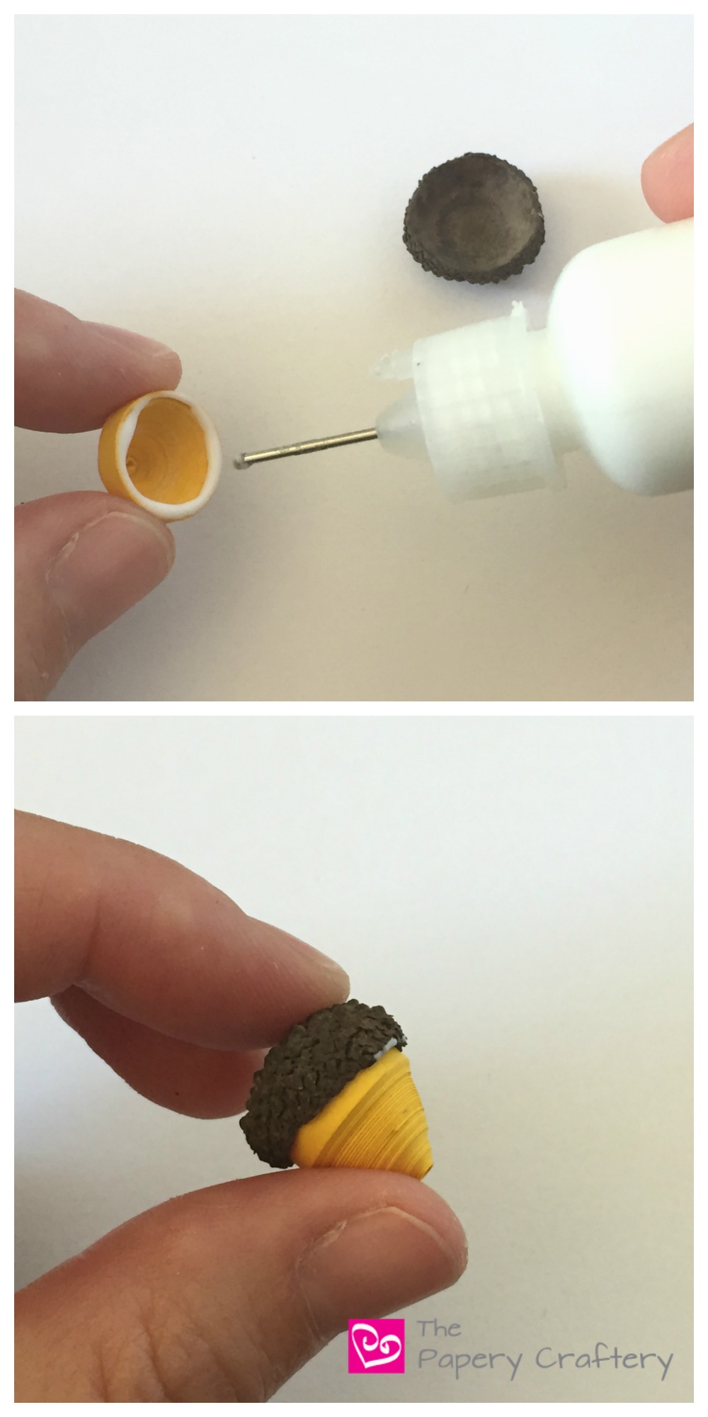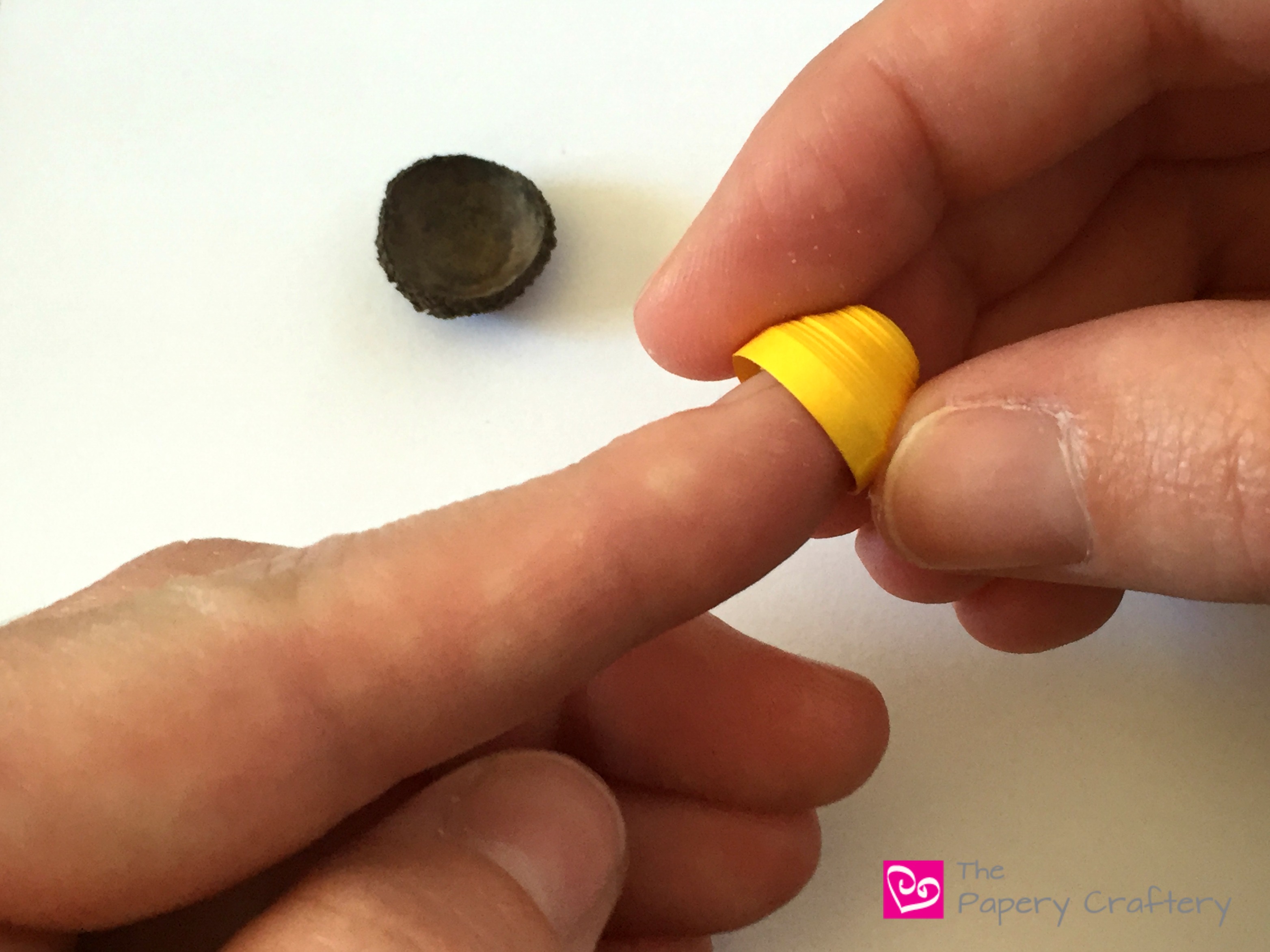 Squeeze a thin line of glue all around the edge of your paper dome and attach an acorn cap.