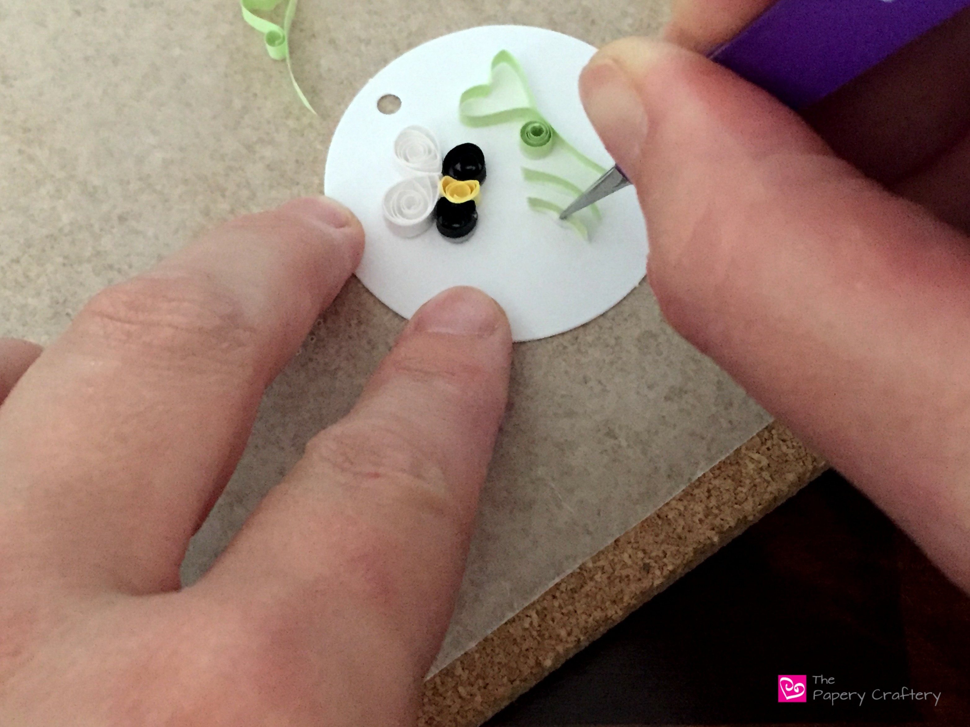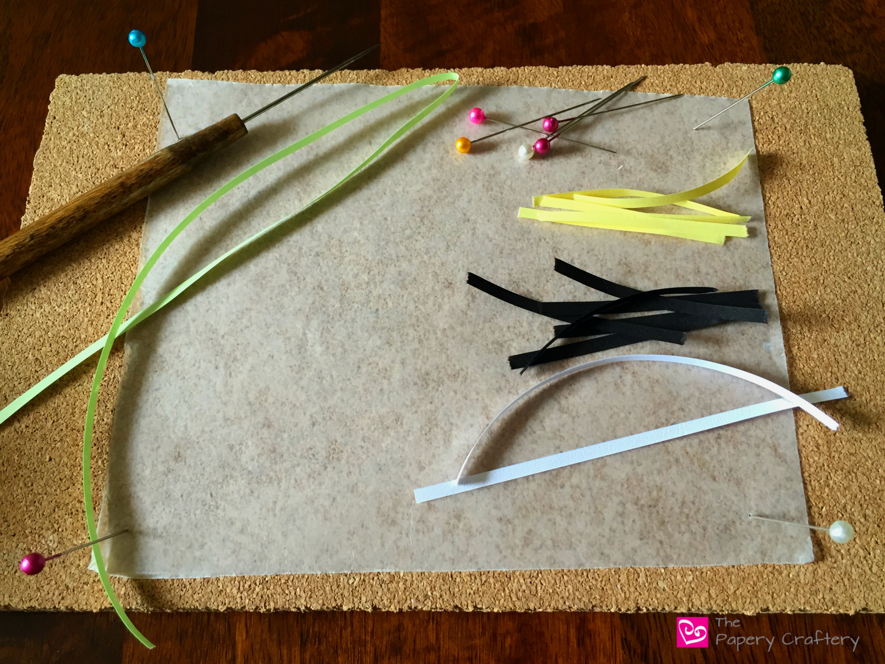 Fairly simple supplies for this project: yellow and black quilling paper for the body of the bee, white for the wings and the green of your choice for the grasses. Β I believe the exact shade of the pale green I’m using here is “Celery”, but use whatever you have.