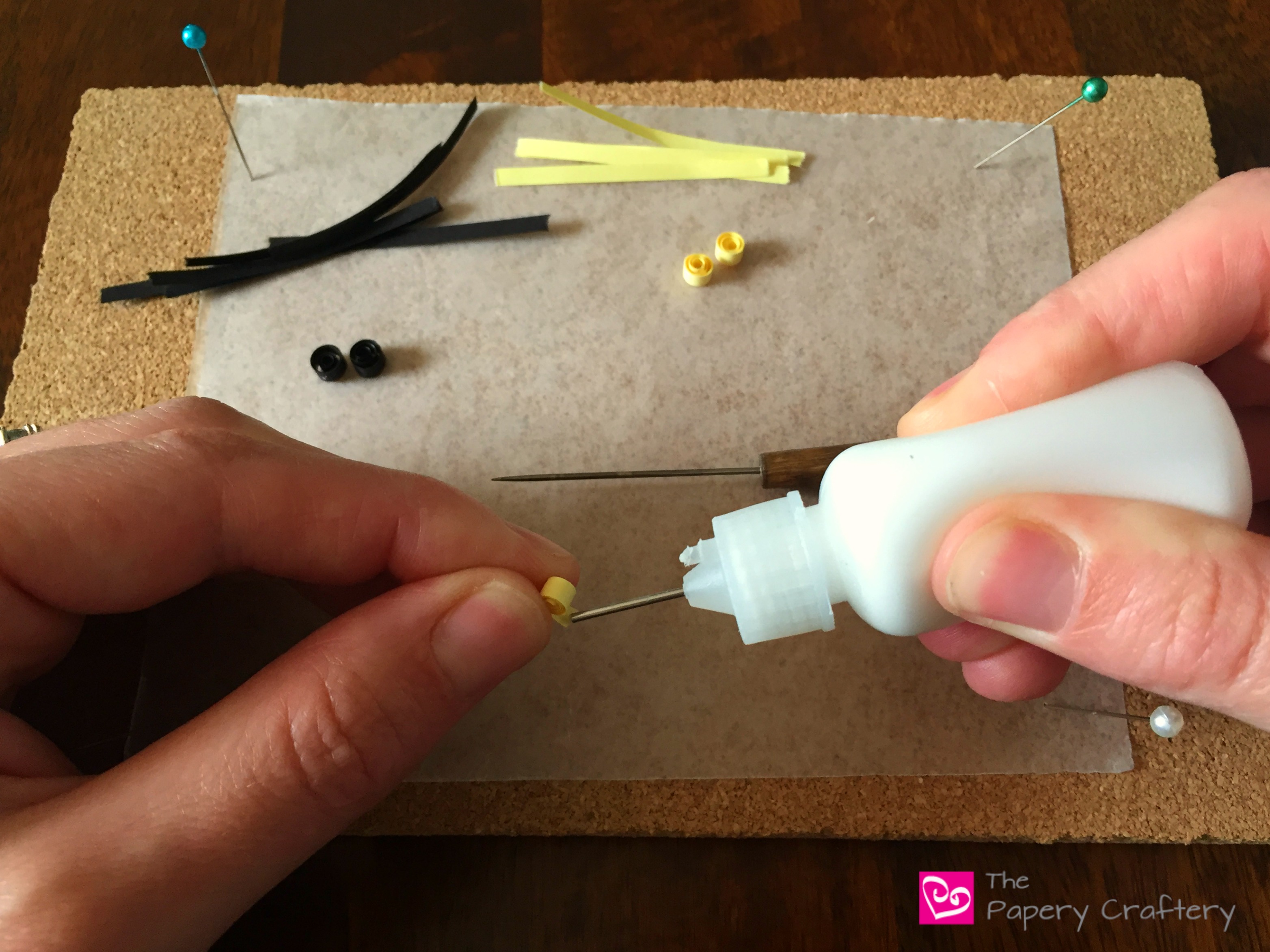I like to use a few straight pins to really push my coils together. I find it makes the bee’s body look more complete.