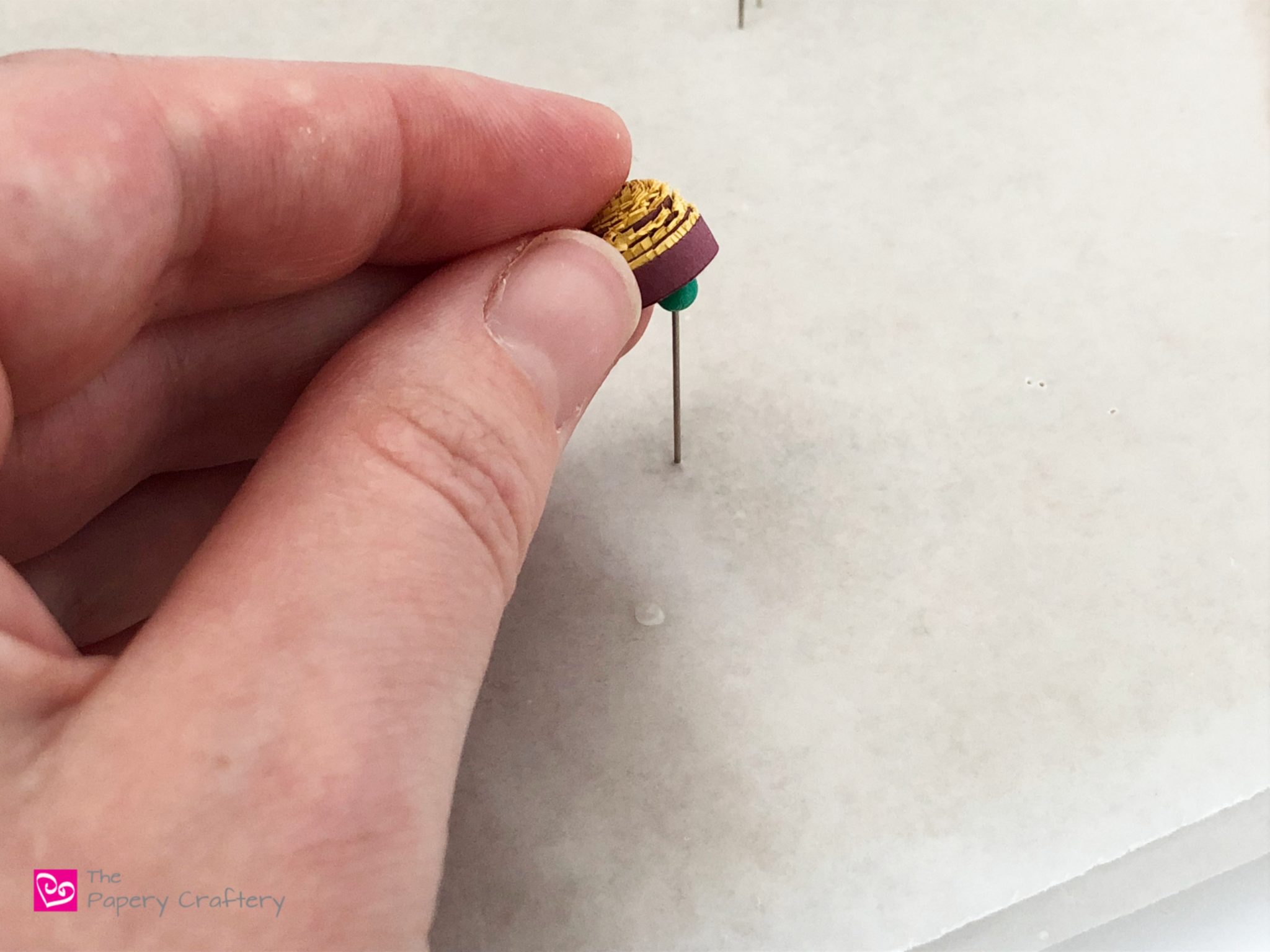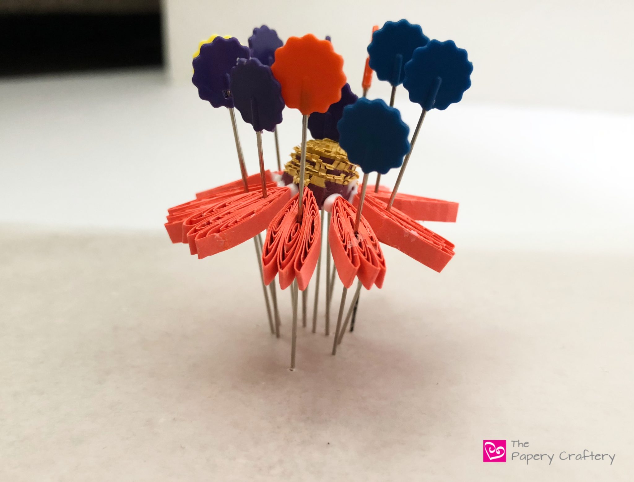 Keep adding your pins and petals all the way around your center.